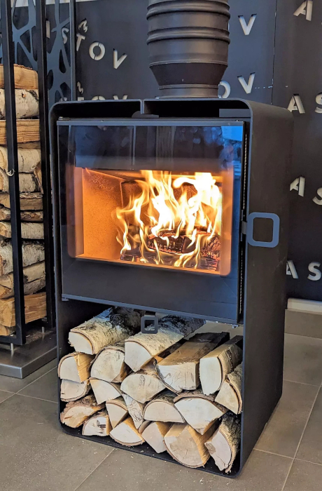Минималистичный корпус печи-камина имеет встроенный дровник и изготовлен из стали, которая окрашена в чёрный цвет.