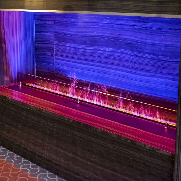 Реалистичное пламя образуется при проецировании лучей на пару. Такая имитация огня имеет довольно высокую степень схожести с реальным пламенем и является полностью безопасной для окружающих, а испаряющаяся вода, повышает влажность воздуха, создает комфортный микроклимат.